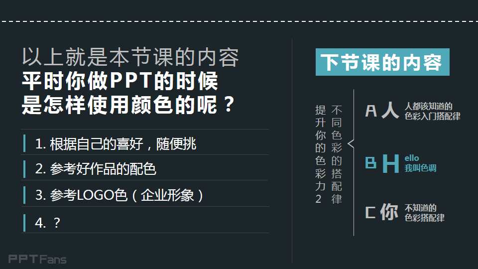 以上就是本节课的内容,平时你做PPT的时候,是怎样使用颜色的呢?