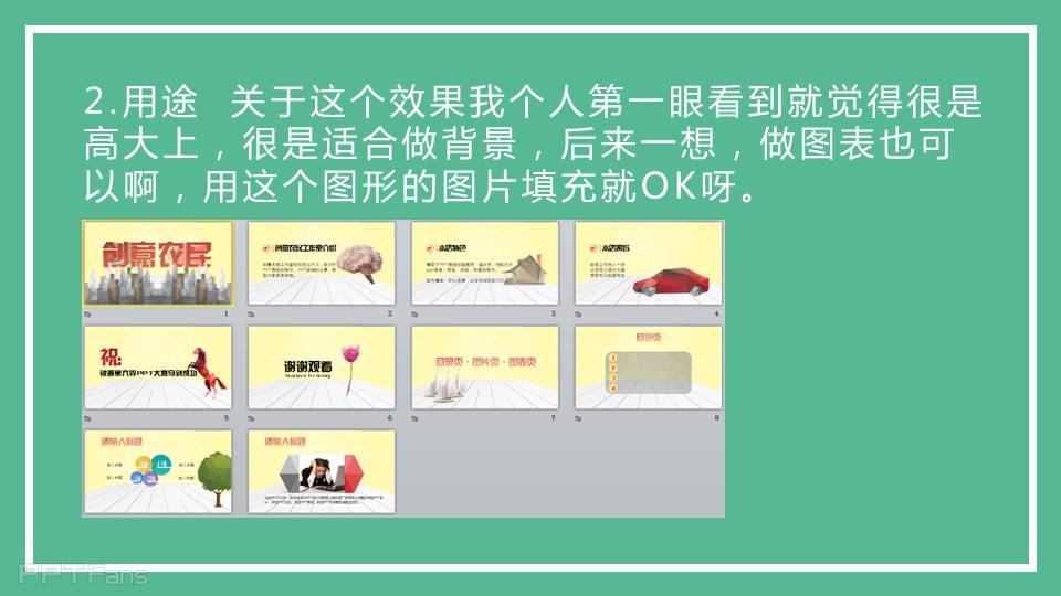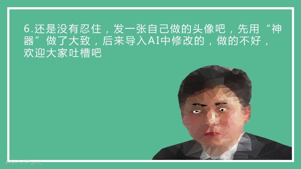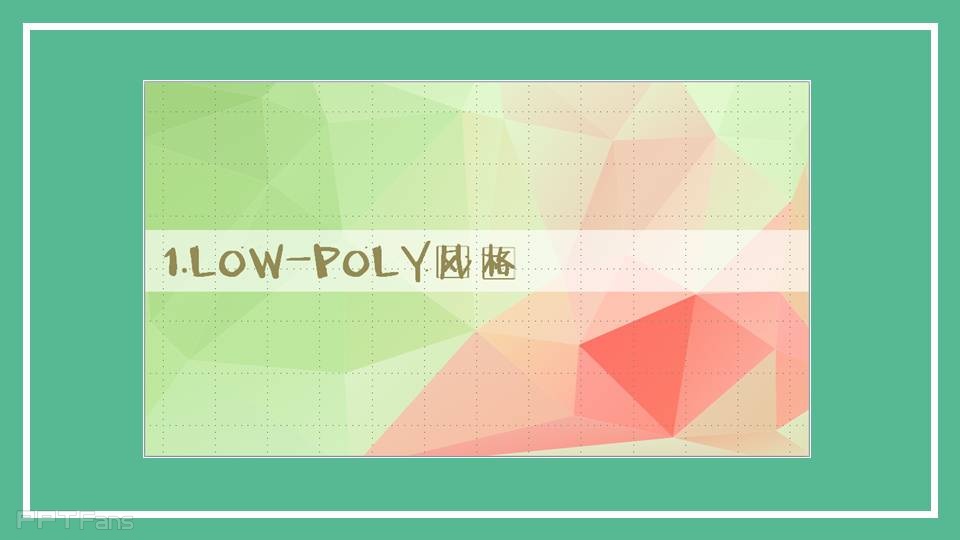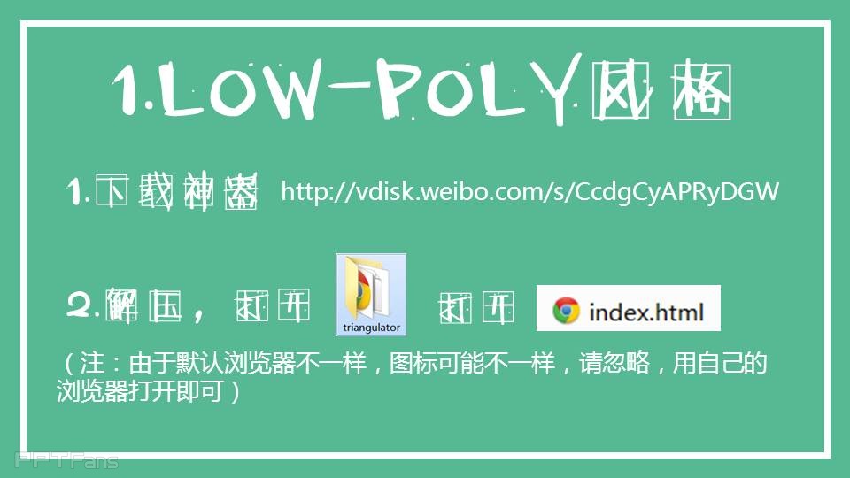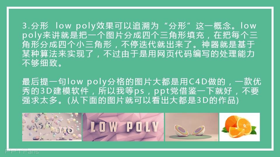 Low poly效果可以追溯为“分形”这一概念。Low poly来讲就是把一个图片分成四个三角形填充,把每个三角形分成四个小三角形,不停迭代就出来了。神器就是基于某种算法来实现的,不过由于用网页代码编写的处理能力不够细致。 最后一句Low poly分格的图片大都是用C4D做的,一款优秀的3D建模软件,所以我等PS,PPT党借鉴一下就好了。不要强求太多。(从PPT中看出,大都是3D作品)