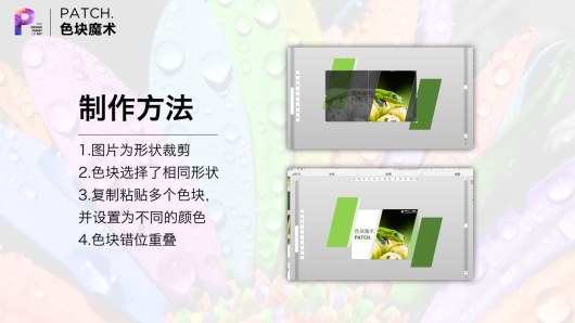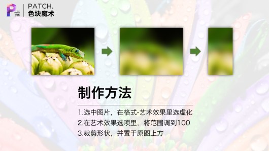 制作虚化色块,需要将图片先复制两份,一份放下面,一份放上面。上面的图虚化,并和下图完全重叠。最后,上面虚化的图裁剪为特定形状。这和色块有本质差别。色块是插入形状。虚化色块是裁剪的图片。
