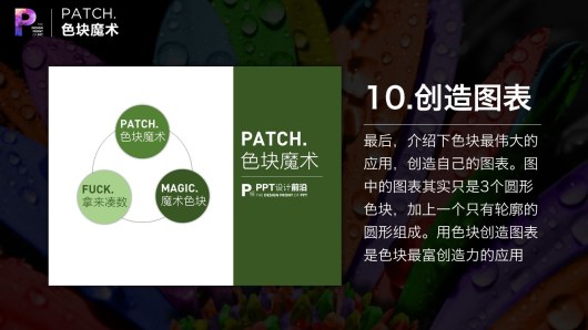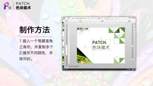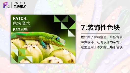 色块除了承载信息。作为”有色文本框”以外,还可以作为装饰,承担美的作用。这个案例中,运用了大量等大的(复制粘贴得到)三角形。稍加排列,效果就出来了。