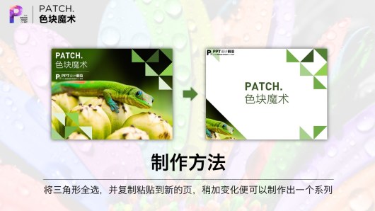 另外,如果将三角形全选,复制粘贴到新的一页,可以快速得到相同的风格。稍加变化,可以得到一个系列风格。一个模板就呼之欲出了。