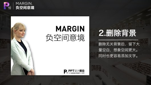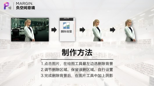 Office2010以及2013版本可以对图片背景进行删除。苹果Keynote亦可。删除无关背景后,留下大量空白,想象空间更大。同时也更容易添加文字。现代广告图片大量运用了这种手法。