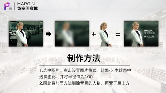 在Office2010以及2013版本中,可以直接对图片进行虚化。其他版本请在美图秀秀中虚化好,再放入PPT。虚化过后,直接放文字当然OK。如果运用前面的方法,把删除背景的人物放进来,重合到原来位置,那么效果就更棒了。