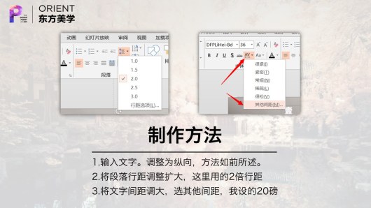 这个制作过程中关键点在于调大行距和字间距。方法如图所示。
