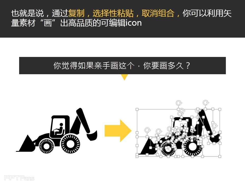 也就是说,通过复制,选择性粘贴,取消组合,你可以利用矢量素材“画”出高品质的可编辑icon,你觉得如果亲手画这个,你要画多久?