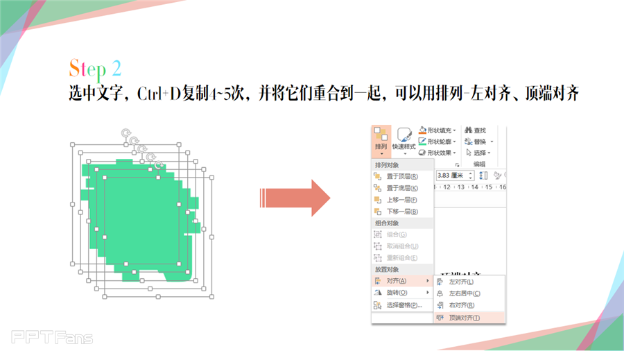 选中文字,CTRL+D复制4-5次,并将它们重合到一起,可以用排列左对齐、顶端对齐
