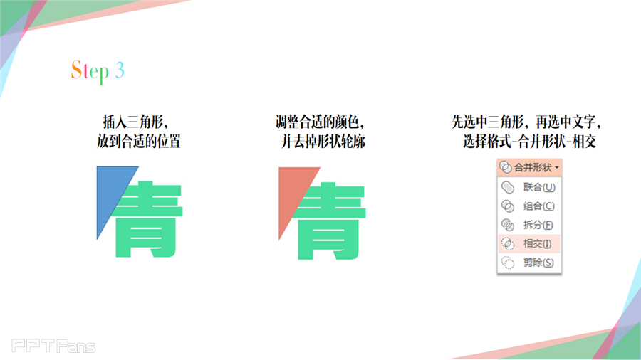 先选中三角形,再选中文字,选择格式-合并形状-相交
