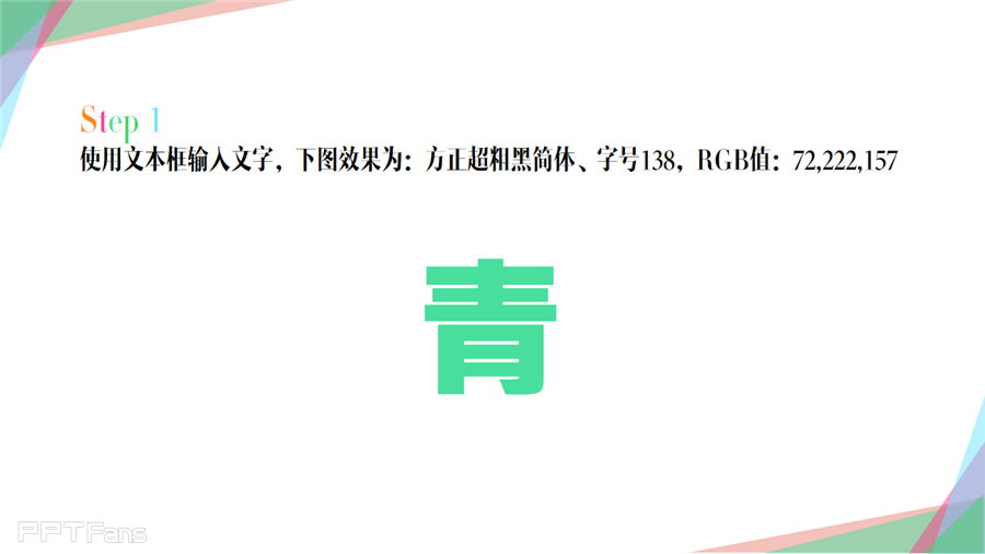 使用文本框输入文字,下图效果为:方正超粗黑简体、字号138.RGB:72,222,157