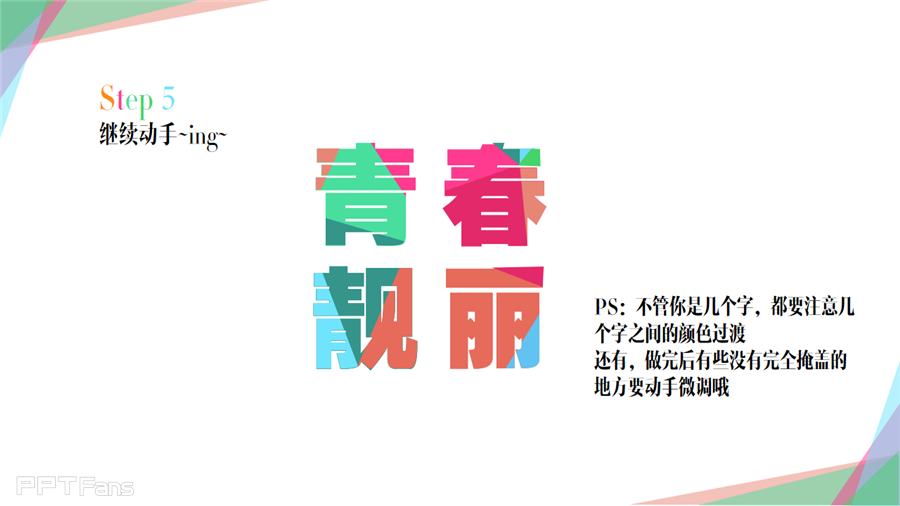 PPT妙用形状制作缤纷色彩字教程,将教会大家怎样去把PPT的文字通过切割成多块,然后涂上不同的颜色,形状的合并、裁切妙用,可以做出很多你意想不到的效果。
