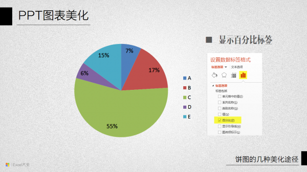 在PPT里面,还可以考虑不使用图表自动生成的标签,而采用自己添加文本框和引导线的方式来设计数据标签和图例。