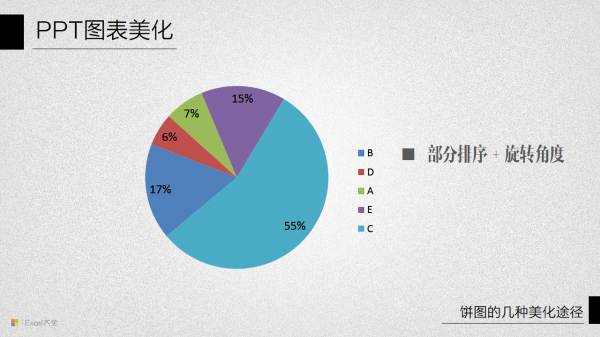 使用上面所说的按数据大小顺序排序的摆放方法,最大的扇区最后会与最小的扇区连接在一起,如果两者比例相差比较大,特别是扇区比较多的情况下,也许会让饼图显得不太和谐,在这种情况下可以在原有排序的基础上,把第二大的扇区放置在最小扇区这一侧(表格中的数据放置到系列的最后),通过这种调整来改善观感。