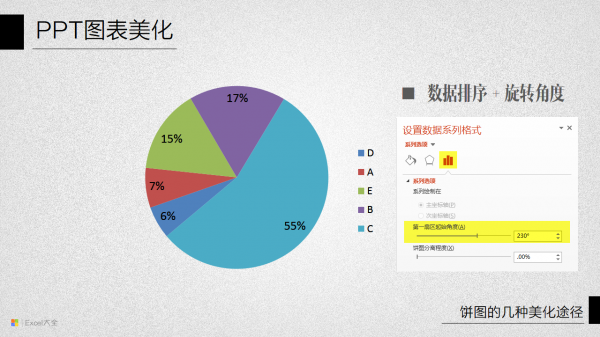 - 饼图中第一个扇区的默认起始位置是12点钟方向(0度),这个起始角度可以通过选项更改,通常来说,把数值最大的扇区放置在4点钟和8点钟方向相对来说可以显得比较稳定和美观。