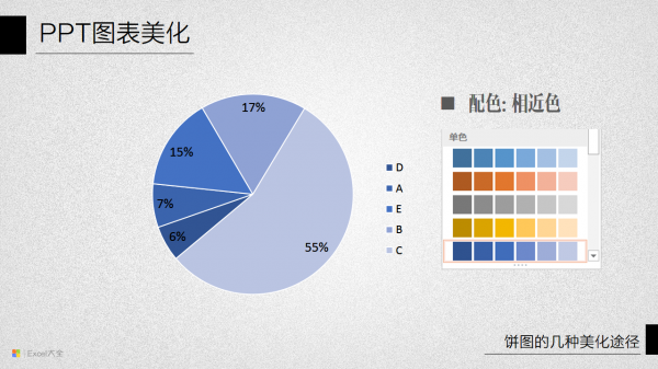 要让饼图显得好看,配色是关键。