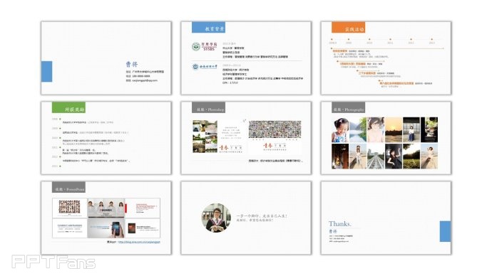 用不同颜色引导相应部分:蓝沉静,介绍经历;橙活泼,介绍活动;绿清新,呈现收获;灰中性,不宣兵夺主。《曹将的个人简历》