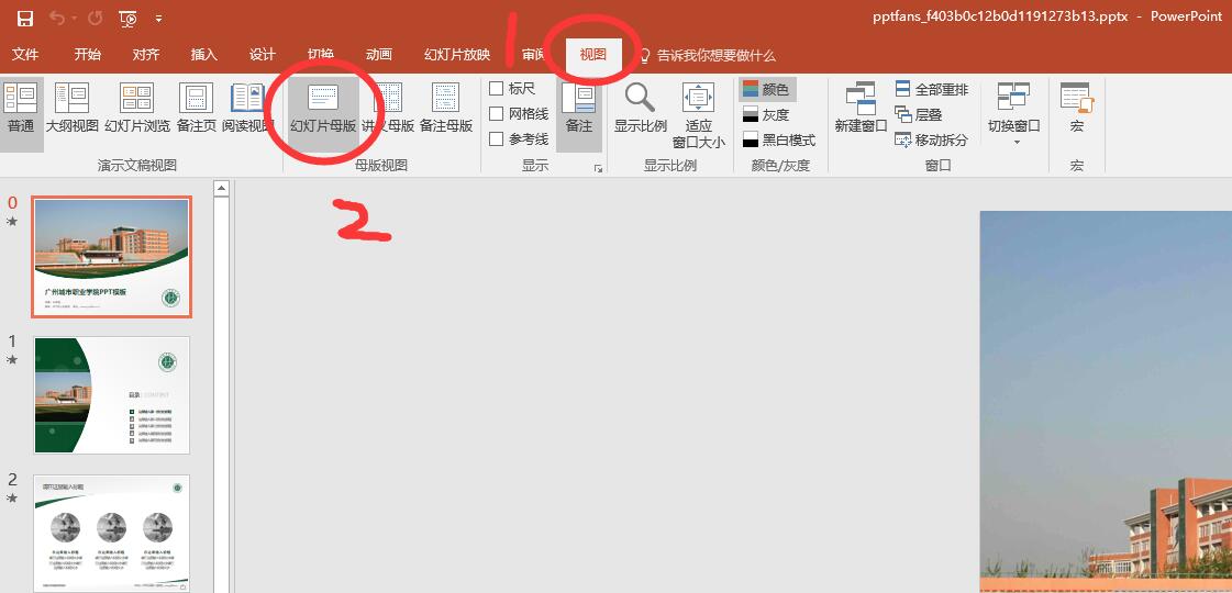 第1步:打开【视图】-【幻灯片母板】