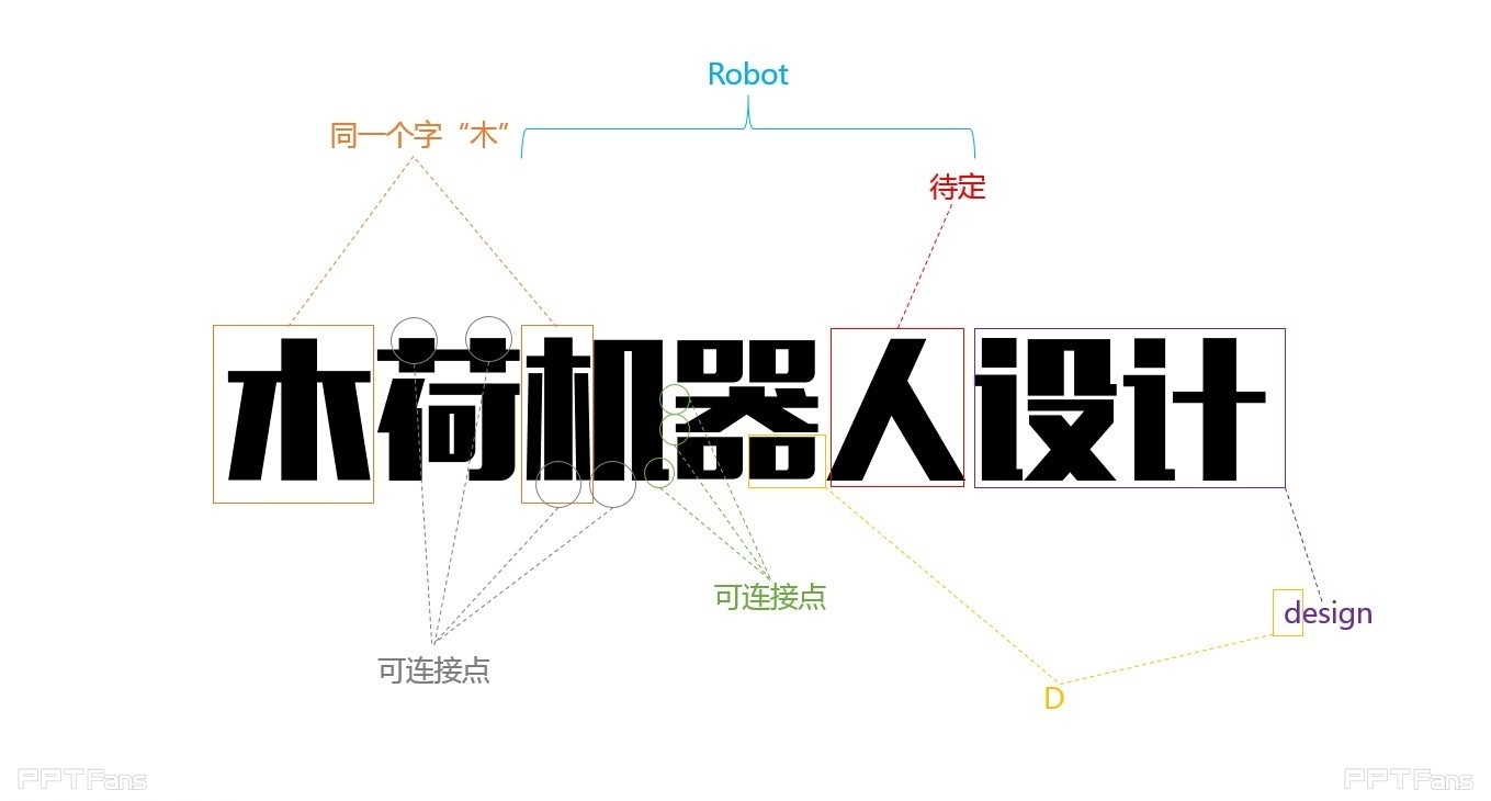 一看到“木荷机器人设计”这么几个字,可能许多朋友会开始在稿纸上比划怎么排了,但是我不认为这是最佳的办法。因为在制作中你首先要选择字体,当不太清楚这几个字用某种字体时的具体构型时,很难找到可以交错或连接的点。我我在制作“木荷机器人设计”全程都是边制作边设计边更改的。