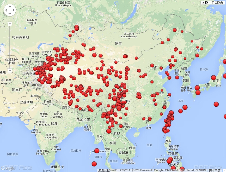 中国地震台网2014年2月5日至2015年2月5日地震数据图显示(红色圈圈越大,说明震级越大),国内西南西北部地震密集,并且强度大,然后是宝岛台湾地区。