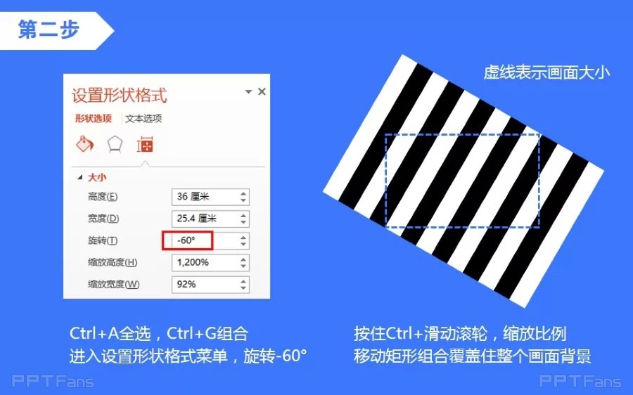 键盘Ctrl+a全选,Ctrl+G组合进入设置形状格式菜单,旋转-60°;按住Ctrl+滑动滚轮,缩放比例移动矩形组合覆盖住整个画面背景。
