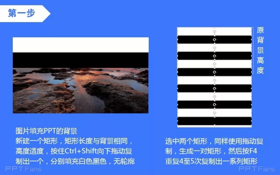 新建一个矩形,矩形长度与背景相同,高度适度,按住Ctrl+Shift向下拖动复制出一个,分别填充白色黑色,无轮廓。选择两个矩形,同样使用拖动复制,生成一对矩形,然后按F4复制4至5次复制出一系列矩形。