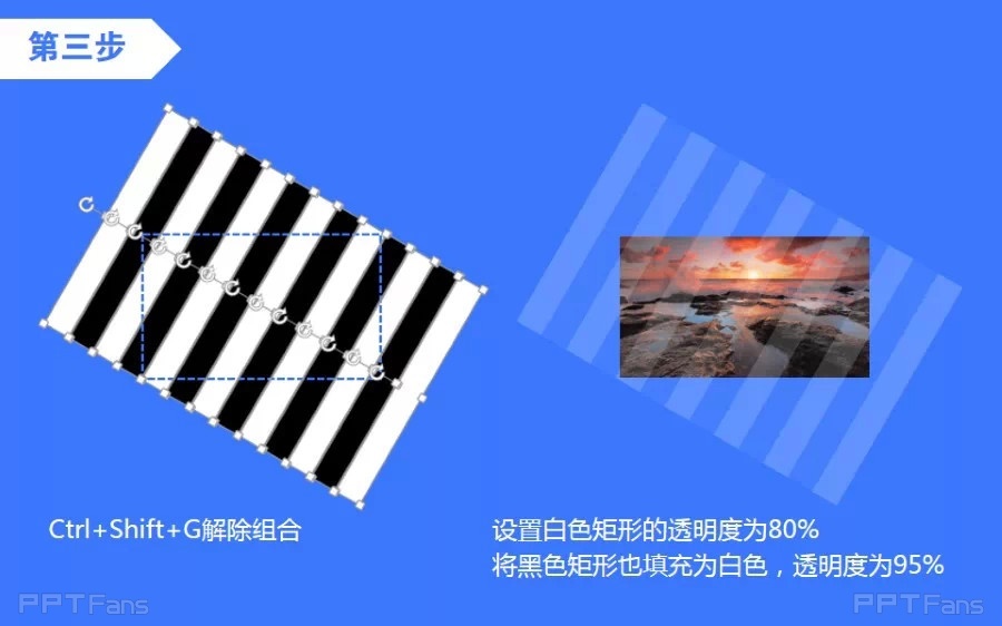 Ctrl+Shift+G解除组合,设置白色矩形的透明度为80%,将黑色矩形也填充为白色,透明度为95%。