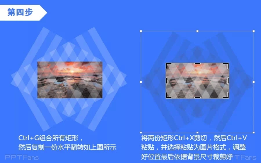 Ctrl+G组合所有矩形,然后复制一份水平翻转如上图示;将两份矩形Ctrl+X剪切,然后Ctrl+V粘贴,并选择粘贴为图片格式,调整好位置最后依据背景尺寸裁剪好。