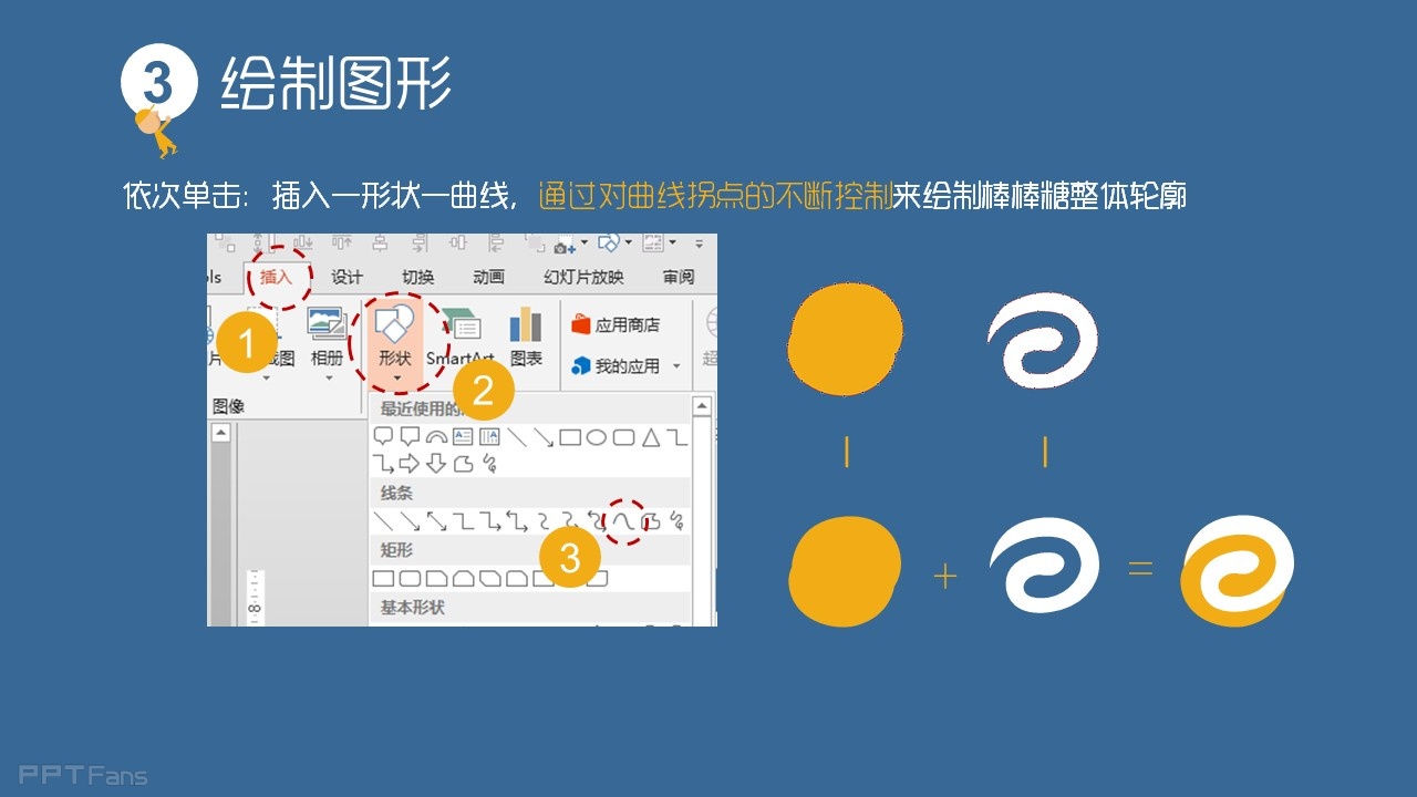 一次单击:插入-形状-曲线,通过对曲线拐点的不断控制来绘制棒棒糖整体轮廓。