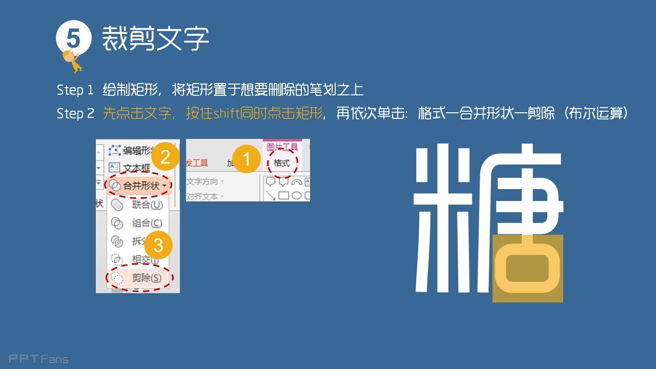 step2.先点击文字,按住shift同时点击矩形,再依次单击:格式-合并形状-剪除