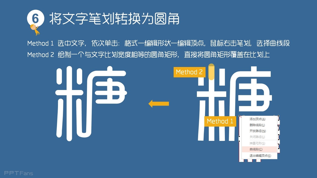 方法1 选中文字,依次单击:格式-编辑形状-编辑顶点,鼠标右击笔画,选择曲线段
