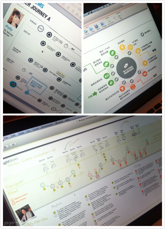 - 方法论:不但要能灵活使用方法论,也需要将方法论的逻辑关系、思维过程阐述得清楚明白,关于定位问题的方法论有很多,它们的本质都是尽可能还原上下文(discover insights),在上下文中定位问题(define problem),常用的有如:Customer Journey Map, Service Touchpoints, Service Circle Map等(图1中所示);另一方面,清晰阐述未来当问题被发现和定位,方法论(流程)将如何帮助我们高效和有效地解决这些问题。 design-methodology