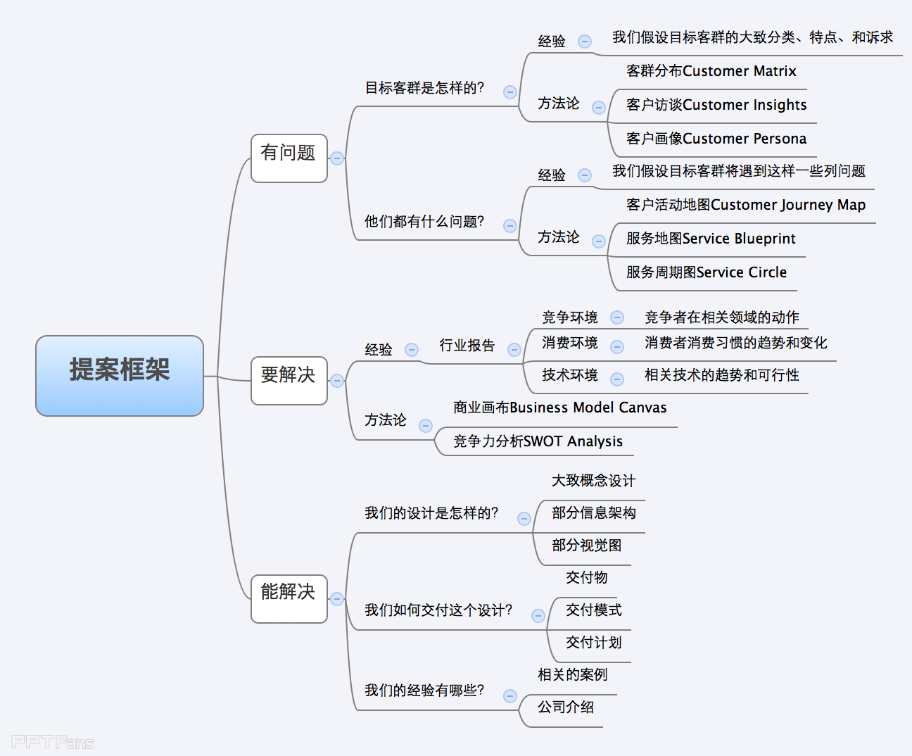 理解了一个提案的基础策略和相关战术之后,一个基本的提案框架应该是怎样的?我经常采用三段式:有问题、要解决、能解决,贯穿经验假设和方法论两个维度的架构,如图3所示脑图,图中的方法论不代表全部,只做举例: