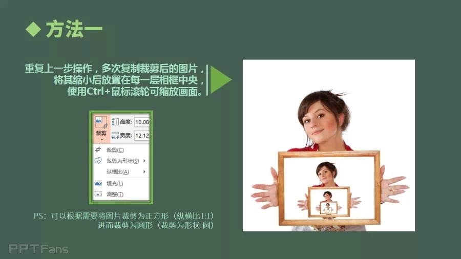 重复上一步操作,多次复制裁剪后的图片,将其缩小后放置在每一层相框中央,使用Ctrl+鼠标滚轮可以缩放画面。