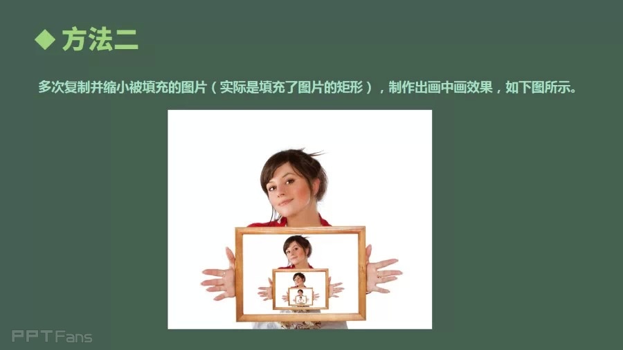 多次复制并缩小被填充的图片(实际是填充了图片的矩形),制作出画中画效果,如下图示。
