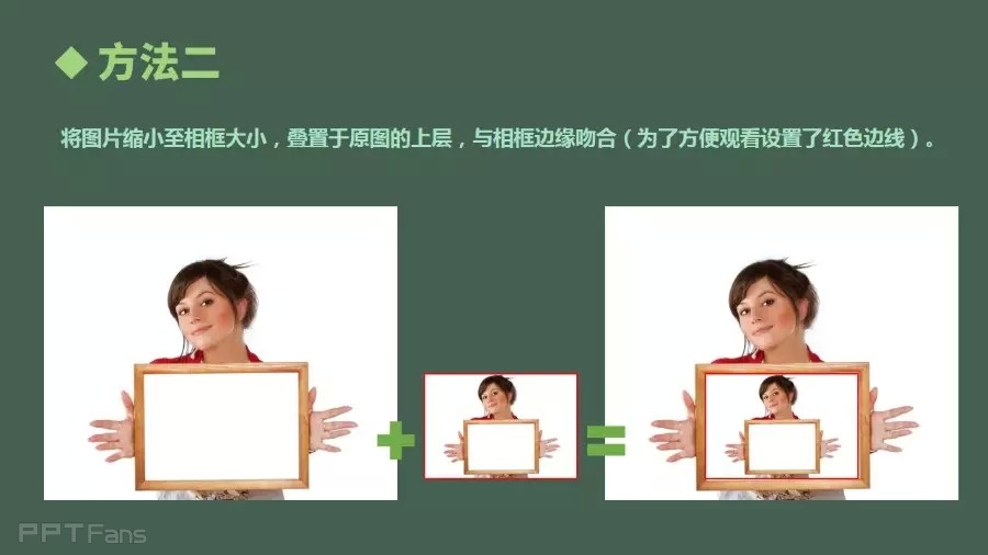 将图片缩小至相框大小,重叠于原图的上层,与相框边缘吻合(为了方便观看设置了红色边线)。
