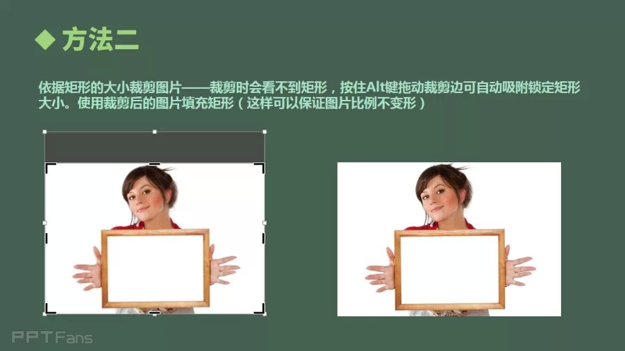 依据矩形的大小裁剪图片——裁剪时会看不到矩形,按住Alt键拖动裁剪边可自动吸附锁定矩形大小。使用裁剪后的图片填充矩形(这样保证图片比例不变形)