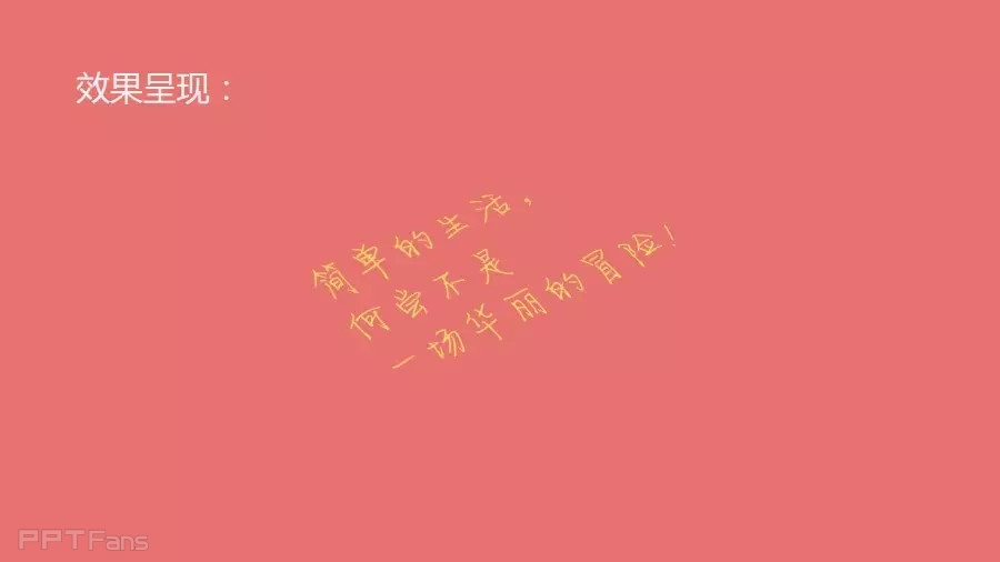 三分钟教程的标题,总是比较“含蓄”,所谓跃然纸上就是用PPT做文字仿真效果。一般做文字仿真,我们都需要用到ps,文字选择手写体、经过自由变换,各种三维角度旋转,然后得到仿真效果。