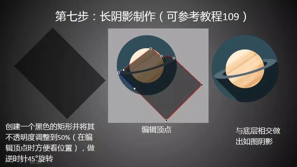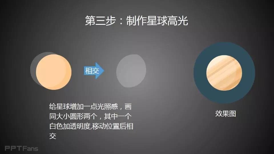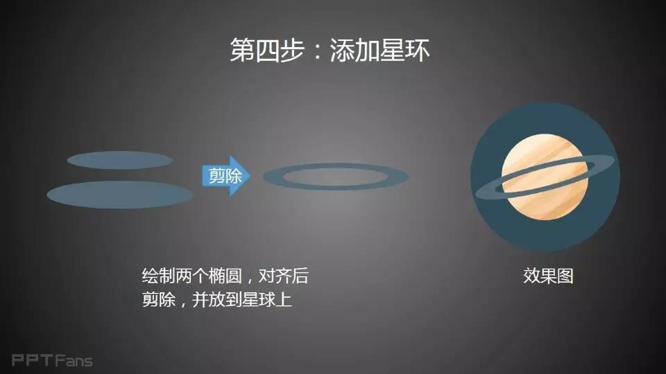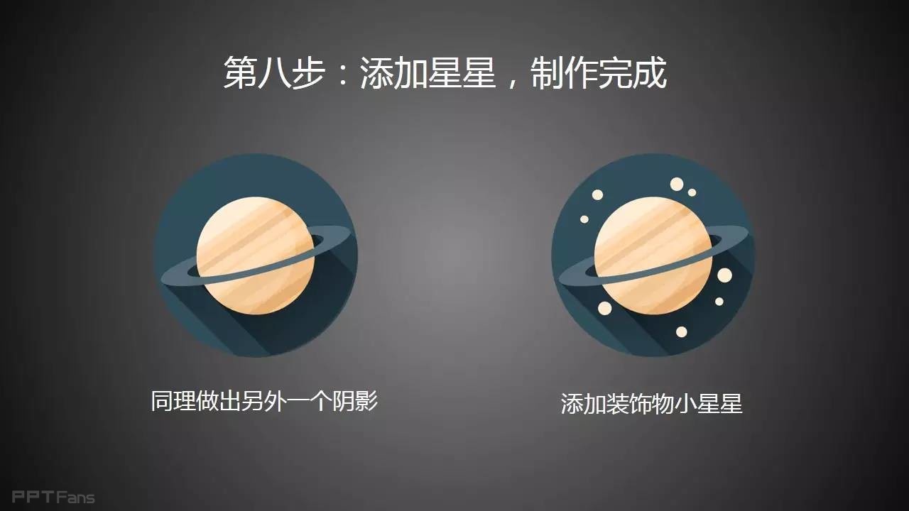 用PPT绘制行星有一定难度,步骤较多,共八大步骤,较为繁琐;技巧较复杂,绘画教程中大量使用图形编辑功能,用于处理不同的图形裁切、合并需要。本教程还涉及到一定的美术知识,光影的处理,还有时下流行的长阴影和扁平化技巧。