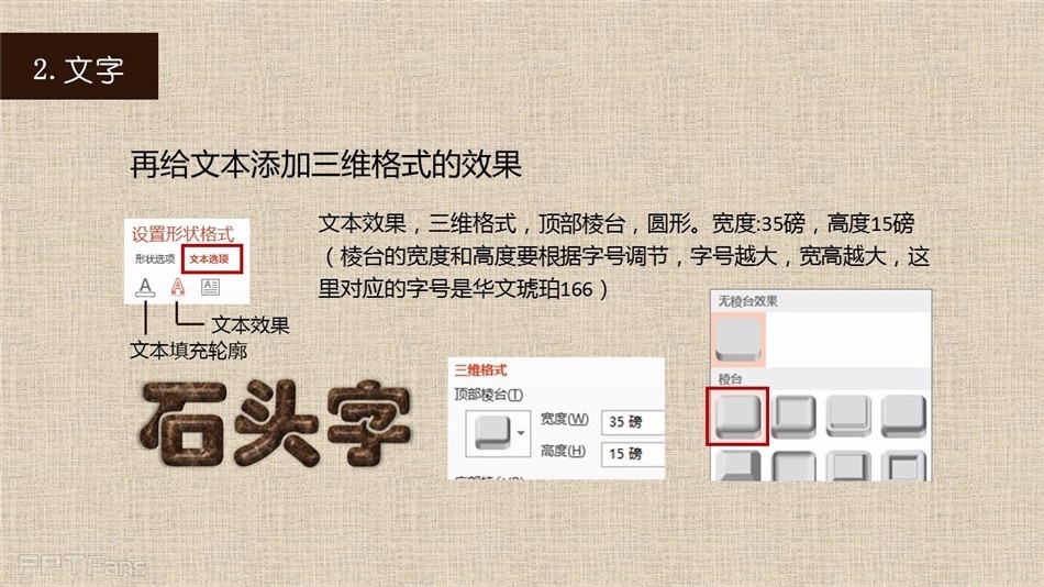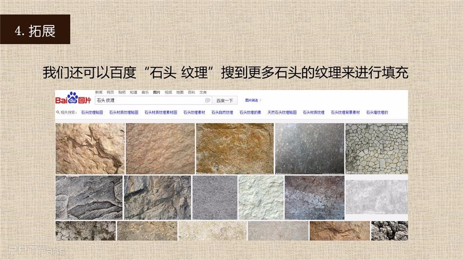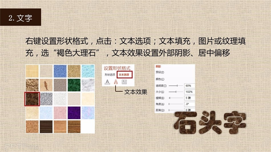 我们前面有讲过PPT制作粉笔字、PPT制作木板字,今天我们讲讲用PPT制作石头字。