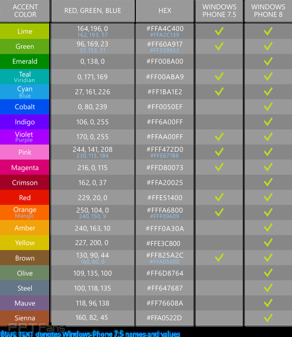 先上一张色表吧。此色表仅对 Windows Phone 起作用,Windows 又是另外一套颜色方案(不是不整合,是两种设备的融合度还不高、使用场景还有很多隔阂的时候,颜色的使用也需要随使用场景的特点而有不同。这点又反映在磁贴的动画上,Windows 上的磁贴不会也是禁止进行前后翻转。)另,此色表是当时的,现在我手里有一台 Lumia 830,它的主题色还多了一种“亮绿”,是为了配合亮绿色背壳而增加的,且它排在最后一位,而不是插队到绿色位置。还有的运营商可能会有定制的主题色,这些暂时都不在我们的考虑范围内。