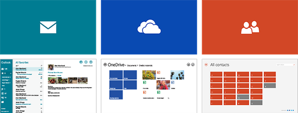 统一配色,并将最需要引人注意的部分用该颜色标注出来,除此之外,用不同灰度的黑色。底部菜单栏也为了和背景形成反差,引起注意。比如邮件应用,被蓝绿色标记的文字是邮件前面几个字的提要,而不是发件人或者其他,这是因为邮件内容是最最重要的,比如“周末一起去野餐吧”这样的邮件消息,而不是“洪国明”这样的名字。(洪国明是微软用于 Demo 的一群名字中的一个,还有“曾树山”等等……如果有关注广告可能会看到。另,Contoso 是微软用于 Demo 的公司名字,几乎每个案例都是说 Contoso 公司,还为其注册商标、开发演示应用。contoso.com 好像是会跳转到 Microsoft 官网。)