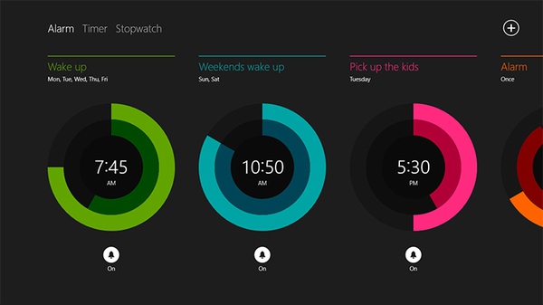 一个案例:多彩的闹钟,下方开关白色为开,否则是关。增强了对比度,这就是在视觉上将开关的状态感知增强了,且因背景是深灰,而非鲜亮色,这种感觉就更强了。当你放眼看这张图的时候就有“一目了然”的感觉。如果用左右拉的开关,并放于闹钟名称右侧,放眼望去,便不会那么清晰了。