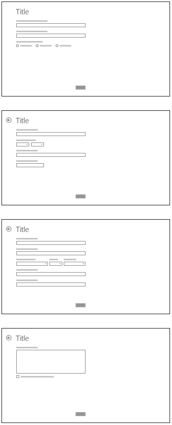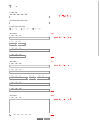 请不要尝试将大量内容置于一个非常长的表单中,而是考虑将任务分成多个组或多个表单序列。下面是分为多个组的较长表单示例(比如你设计的问卷,一长串连在一起,对方看到就觉得很多,看着不舒服,带来一种烦躁感。这不是 Modern UI 所提倡的,而应该简单化,有焦点。因此要分页):