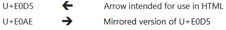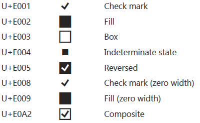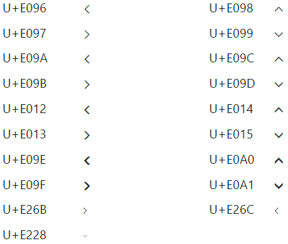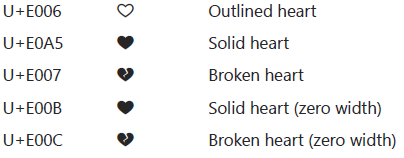 大部分此类字形在提供时其间距为零。你可以在每个零宽度字形上放置其他零宽度字形。例如,如果你插入零宽度的红色的实心 (U+E00B),光标不会跑到心形的末尾,因为其宽度为零。然后,如果你插入黑色的心形轮廓 (U+E006),则心形轮廓会放置在实心之上。
