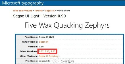 我想这大概就是佳伟截图中出现两种不同样式的 Segoe 的原因了:微软中途发布了新版本的 Segoe 字体。