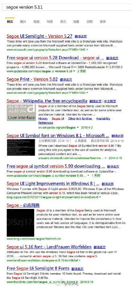 Segoe 字体本身是不包括中文的。微软当前对它的用法是,与微软雅黑中文搭配成新版 YaHei Light,或与方正中等线搭配成 Windows Phone 自带 DengXian 字体。所以呢,也许是 5.11 版本打包的时候出错了,直接将一整套微软雅黑扔了进去……(注意5.11与其他任何版本的中 文字体都不一样,其他的选择了默认宋体作为中文字体缺失时的替换展示字体,而 5.11 版本带有雅黑)