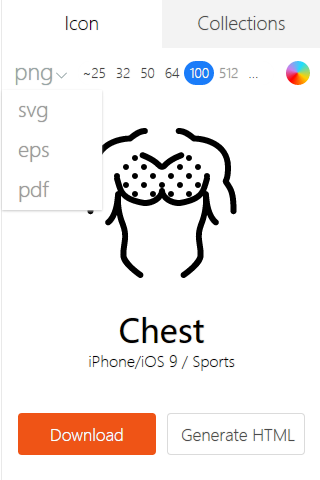 比如选择如图所示的一枚叫做“Chest”的图标,只需单击即可选中,并出现到右侧设置面板中。而在右侧的Icon面板上的菜单栏,可以清晰地看到从左到右分别为格式设置、大小设置和颜色设置,而下载按钮则位于图标下方。PS:点击png右侧向下箭头即可看到其它格式,但是免费版只能下载png;至于图标大小,免费版最大只能下载到100px。