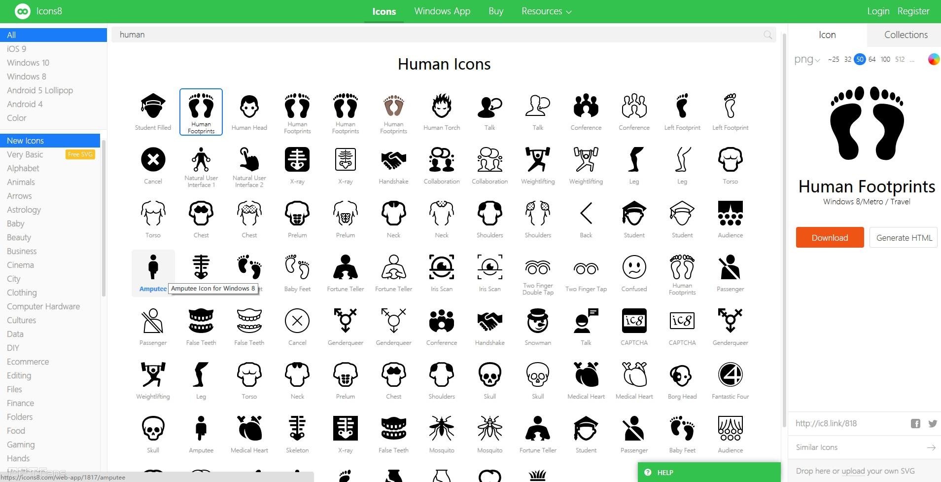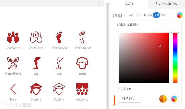 我们只需在搜索框内直接输入所需图标的关键词,即可得到满足关键词的图标结果。PS:只支持英文哦。比如,我们输入human后,点击回车,即可跳转到如下界面,左侧就是类别索引目录了,我们也可以在这里快速找到所需图标。而右侧是在确定图标后,一些基本的大小、颜色、格式的设置。
