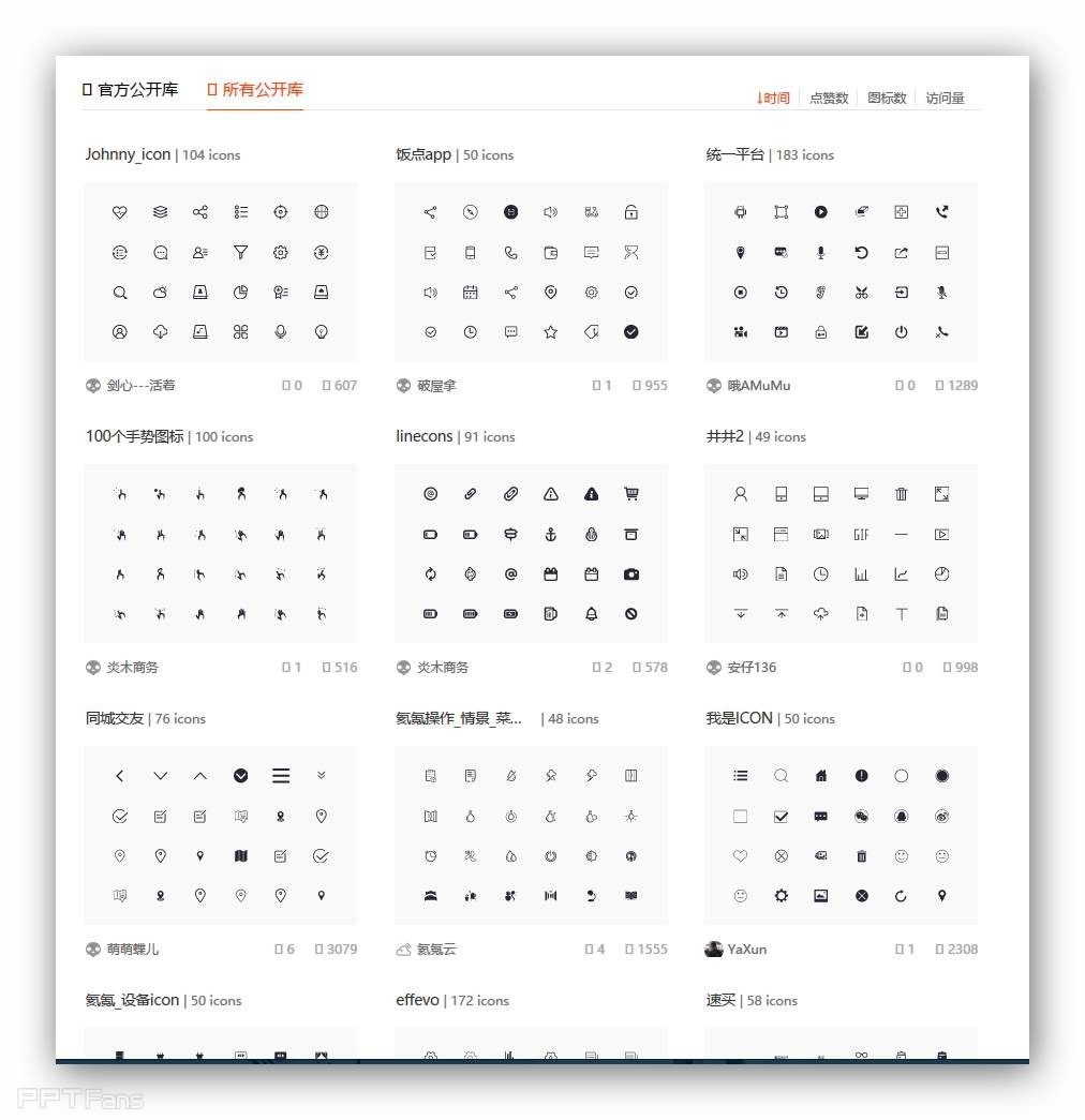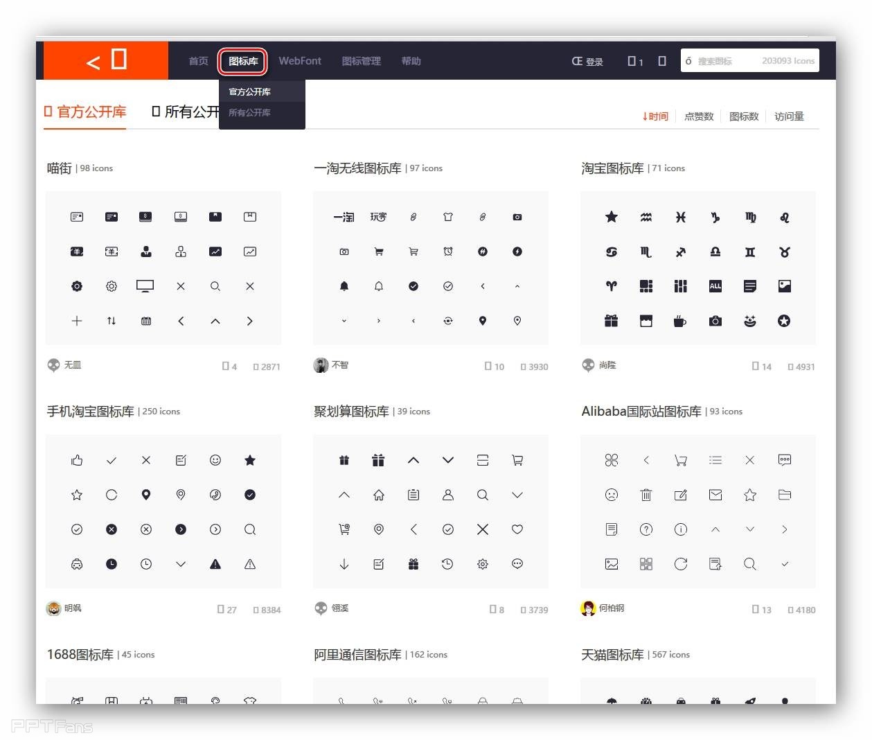 这个网站是阿里的,支持中文,http://www.iconfont.cn/登录网站后直接就看到了长长的搜索框了,直接输入所需图标关键词即可。当然,在我们不知道找什么图标时,可以去顶部菜单栏找“图标库”频道,这里分为“官方公开库”和“所有公开库”两个子频道,前者是阿里系网站的图标库,当ppt需要阿里系图标时来这里总不会错。