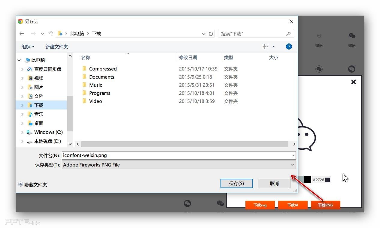 设置好图标后,直接点击相应的下载即可保存了,比如点击下载PNG,然后在弹出对话框中选择保存位置保存,应用到PPT中即可。