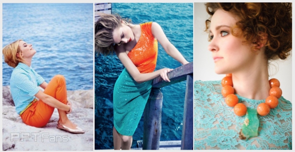 时尚领域同理,互补色中总能让一个颜色特别出挑。蓝橙互补是我个人最喜欢的互补色组合。当然红绿、紫黄等等也是常用且很好看的。