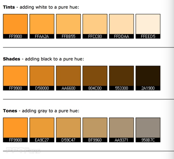 这个好好说下,调过颜料的童鞋们都知道,原有的颜色我们叫做纯色,也就是出现在色轮里面的颜色,它们是在色相上进行横向的变化。然后上面这些小格格们就是纵向的变化啦,也就是驶向“高级”之路。